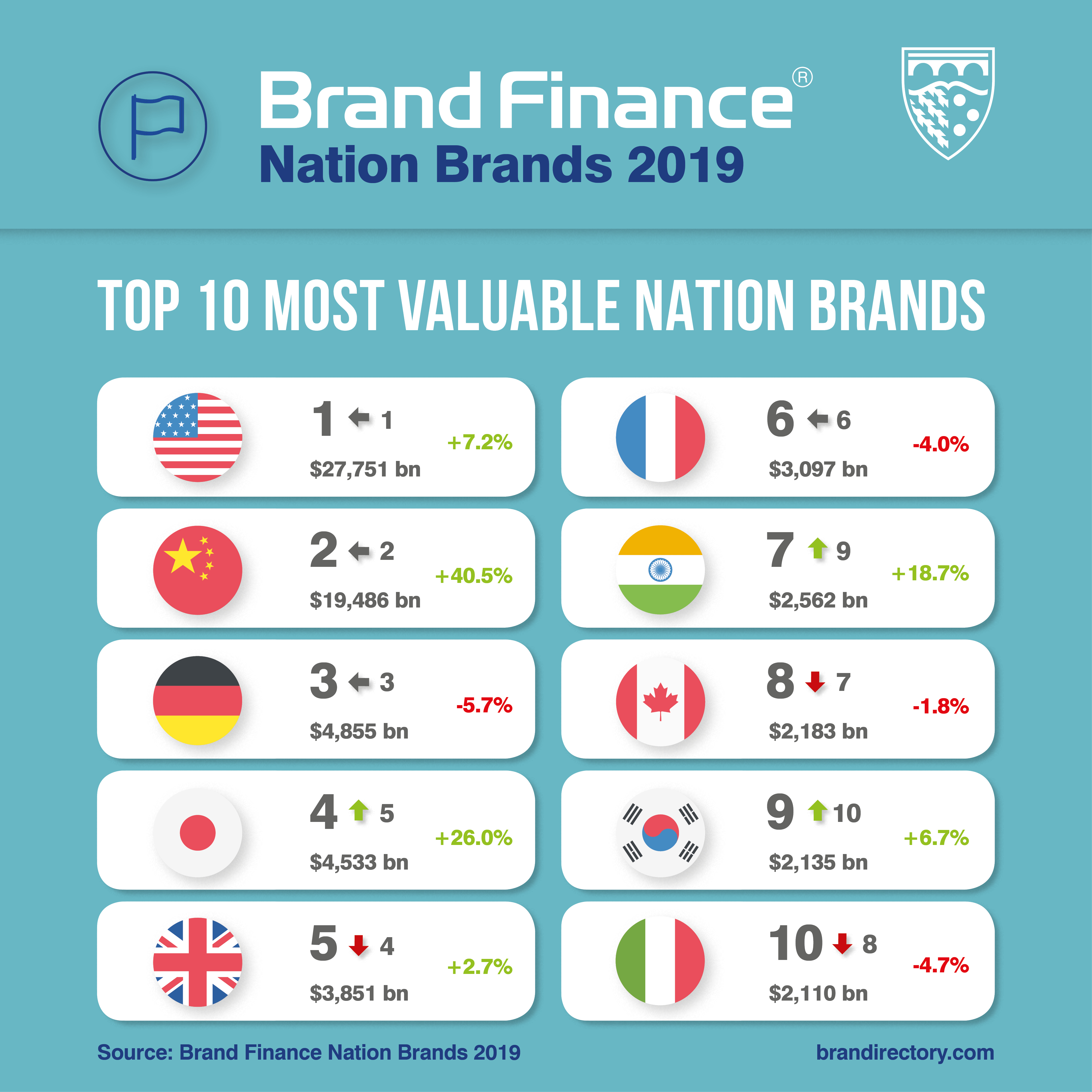 Claiming second position, China continues to grow at a very healthy rate, recording an impressive 40% increase in brand value to US$19.5 trillion. Building on its solid performance in previous years, China is closing the gap behind long-standing leader the US, which has recorded a brand value growth of just 7% over the past year. The difference in value between the two nation brands has dropped from US$12 trillion last year to just over US$8 trillion in 2019.