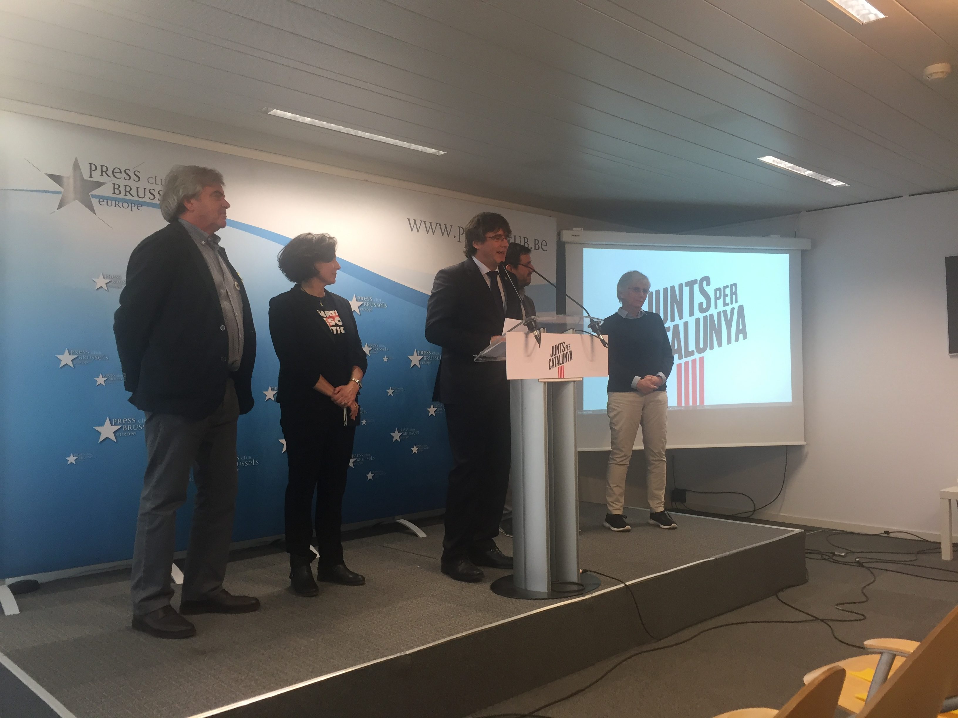 Flanked by four colleagues from the party “Junts per Catalunya” Gorka Knorr, Erika Casajoanna, Calara Ponsati and Toni Comin, Puigdemont was upbeat about his chances and thought that the party would win 2 electoral seats.
