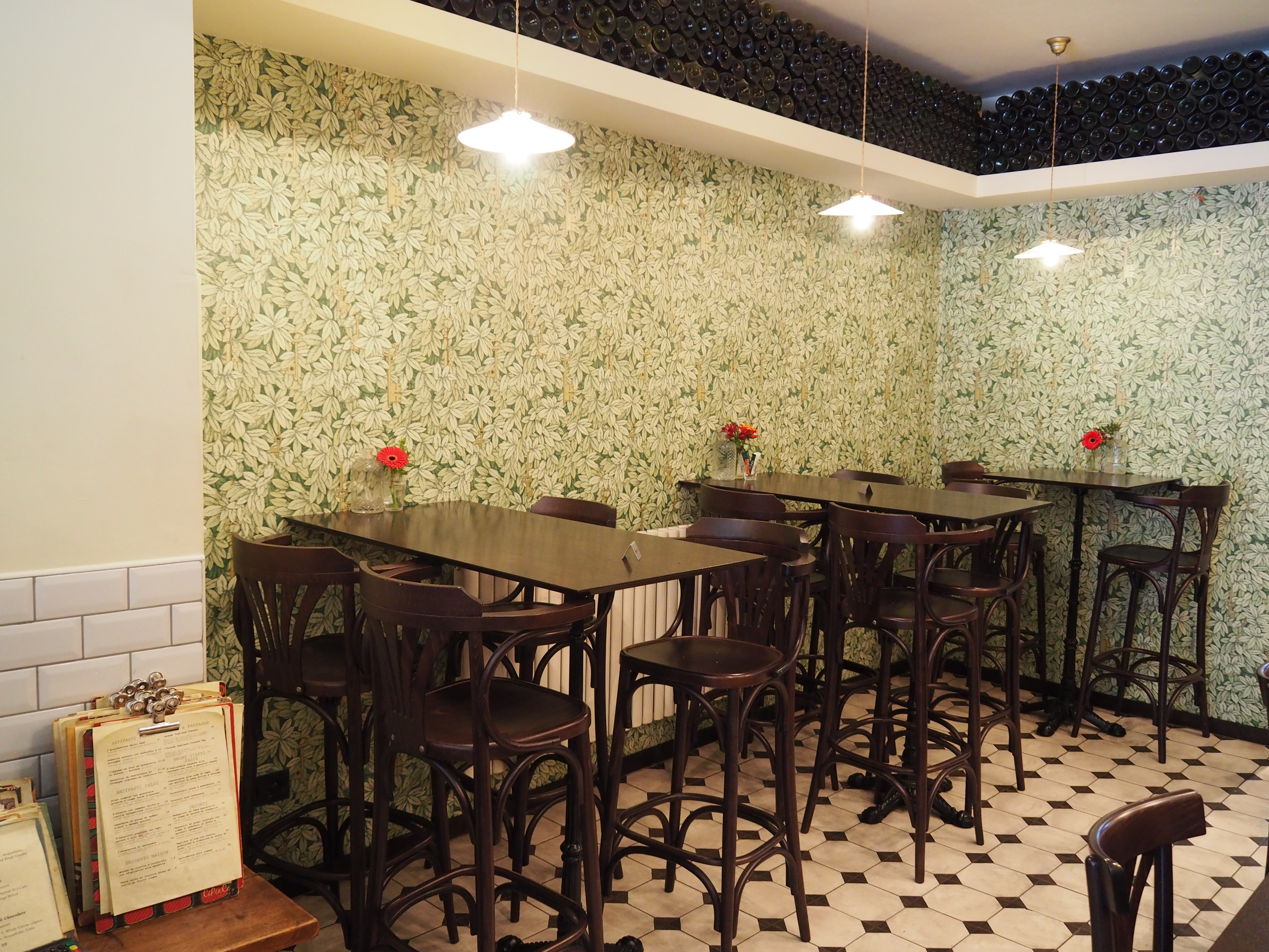 Located right on Parvis de St Gilles, Cipiace is a bar you won’t miss when passing by. The dark green framed entrance will catch your attention and so will the bar keepers, who are energetically shaking and mixing drinks to the right at the long bar. They’re surrounded by dimmed lights and plant-wallpaper displaying leaves in several green tones.