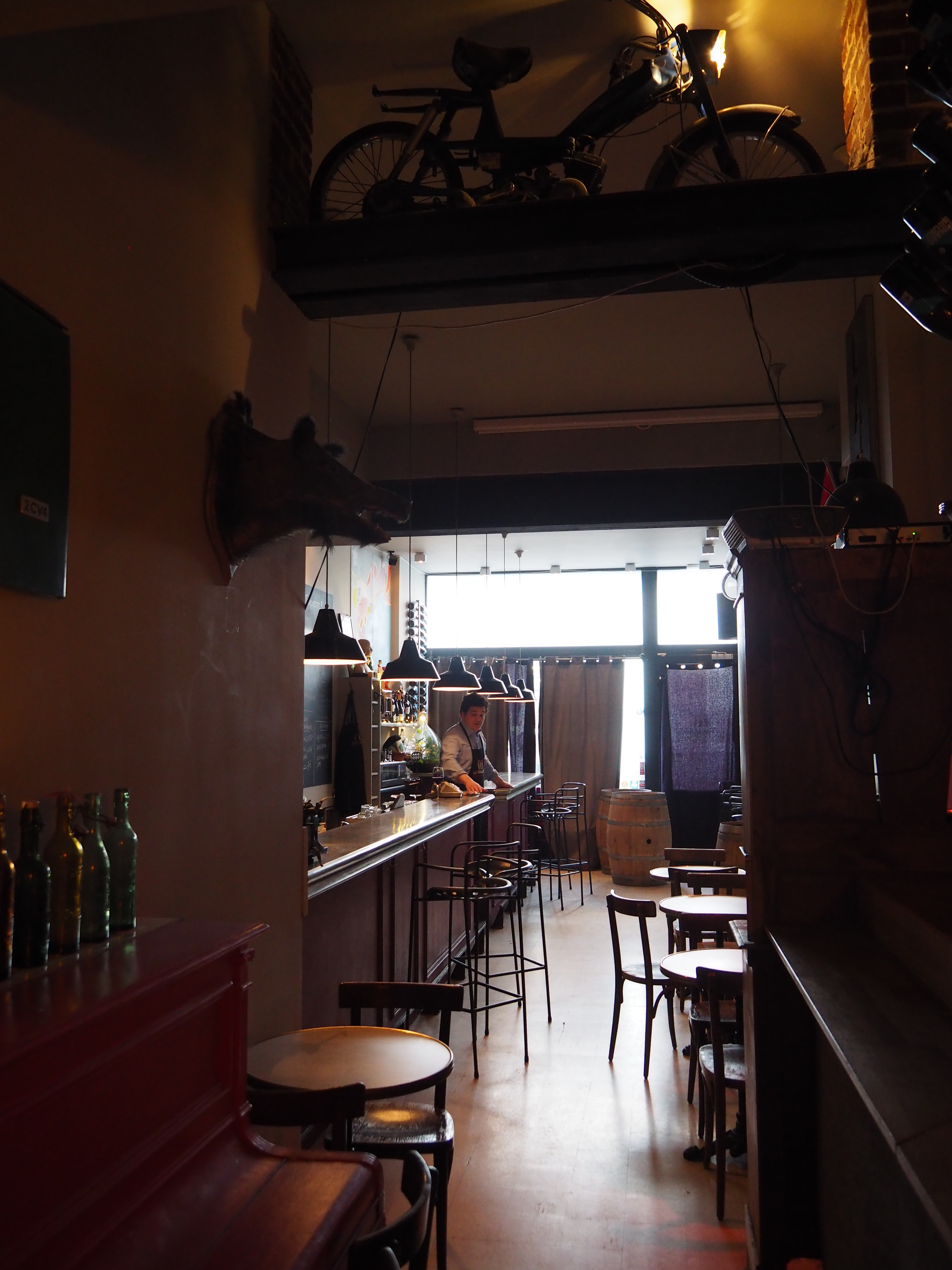 When you step inside of La Trinquette, there’s several seating options to consider. Either you sit right at the long bar – decorated with plants, glasses and industrial lamps – where you’ll be facing Henri and his crew, who are always up for a good laugh and some French humour. The other option is to find a romantic corner somewhere in the back at one of the rustic wooden tables, surrounded by decorative, antique gimmicks. There’s even an old piano and some paintings in the open room at the back of the bar, which is great for big groups. If you’re more of a ‘see and to be seen mood’, you can also sit on one of the bar stools around a big wooden barrel. It serves as a table for your numerous glasses of wine – because you will most probably want to try all of the different ones.