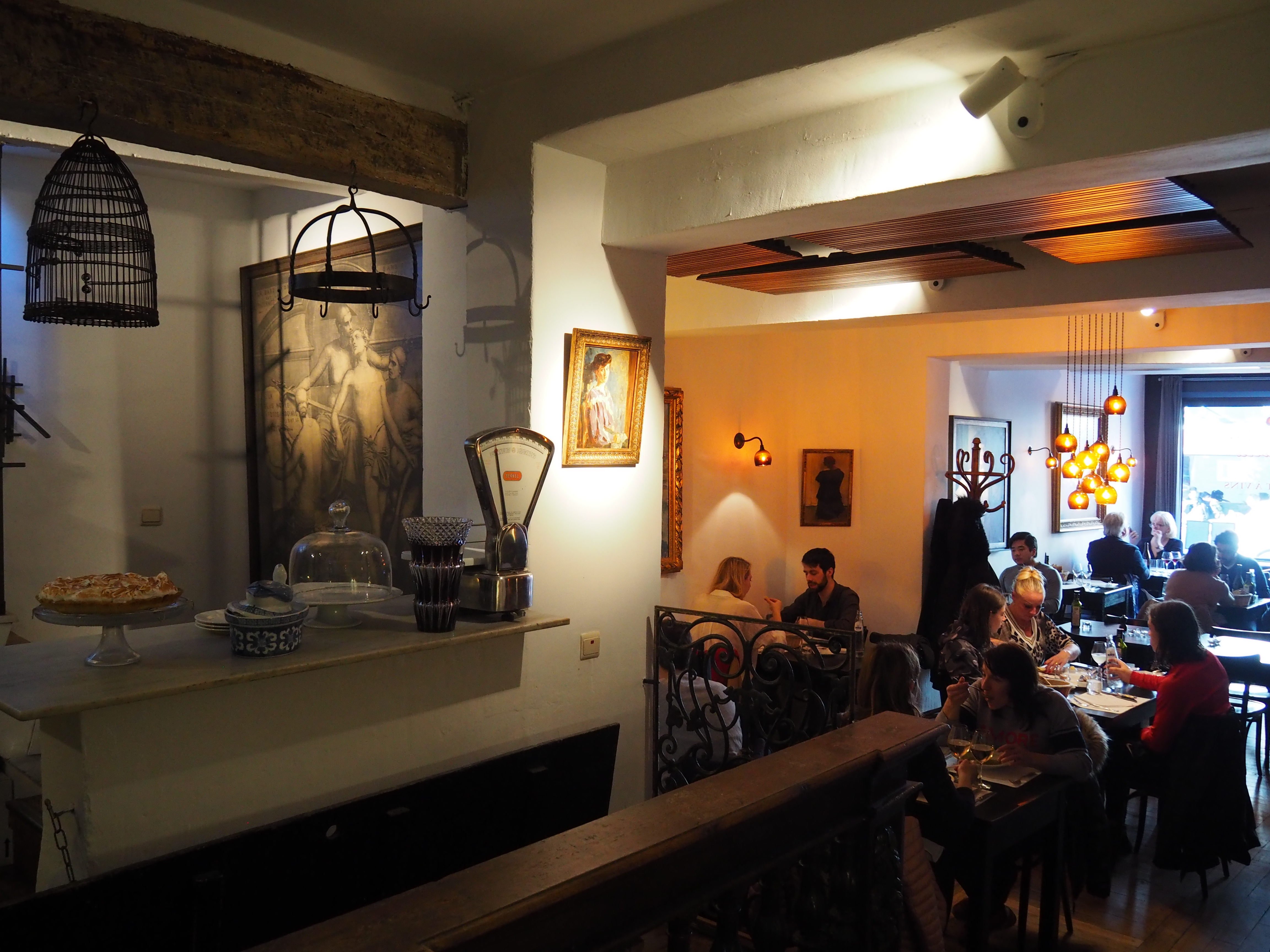 On two floors, dark wooden tables take up most of the space in the large dining rooms. The tables are placed close together, but just far enough so you avoid overhearing the conversations of your neighbours. The warm, dark orange lamps hanging from the ceiling, illuminate the place just enough to shed light on the old, golden-framed paintings that decorate the walls.