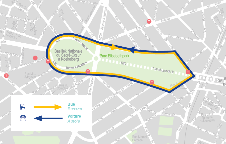 The Leopold II tunnel will be closed again during two summer months starting from June 28th. In anticipation of this closure and already from June 15, a unique direction is established around the Elisabeth Park and the Basilica, in order to avoid that the traffic of transit penetrates in the living quarters.