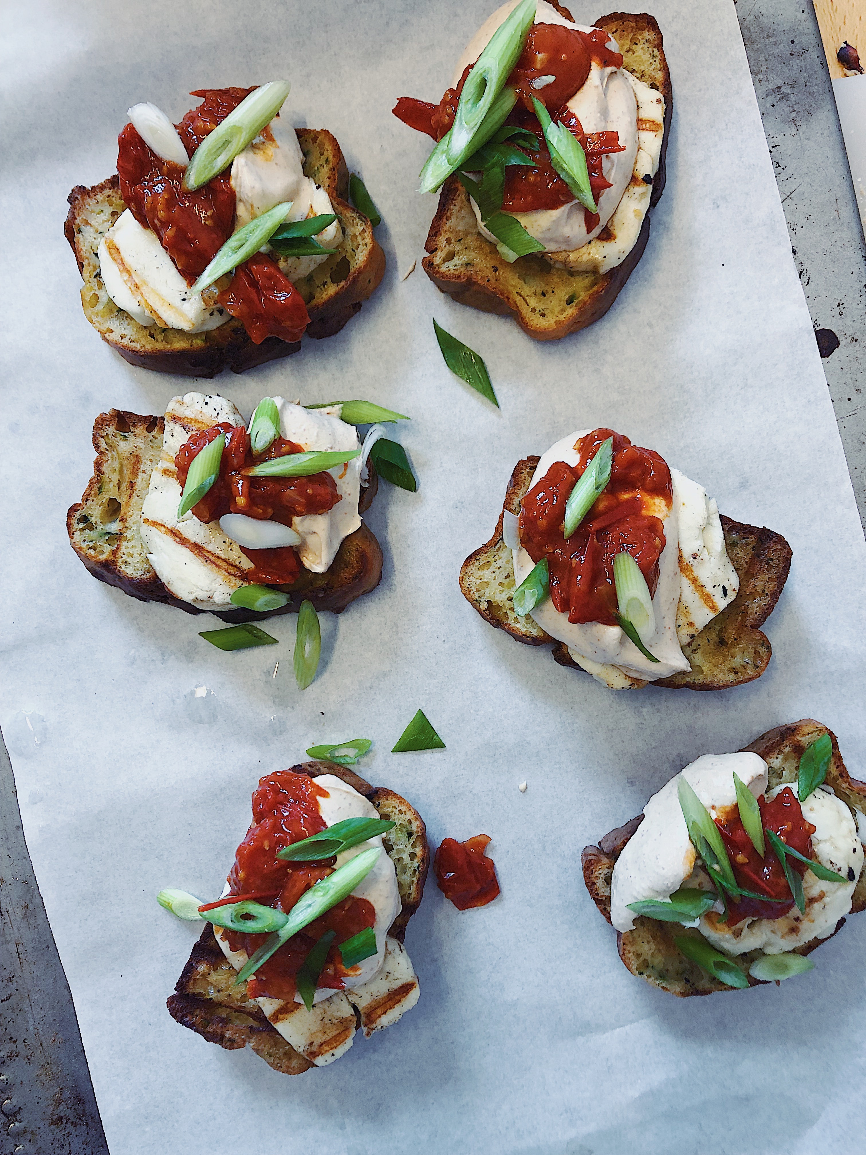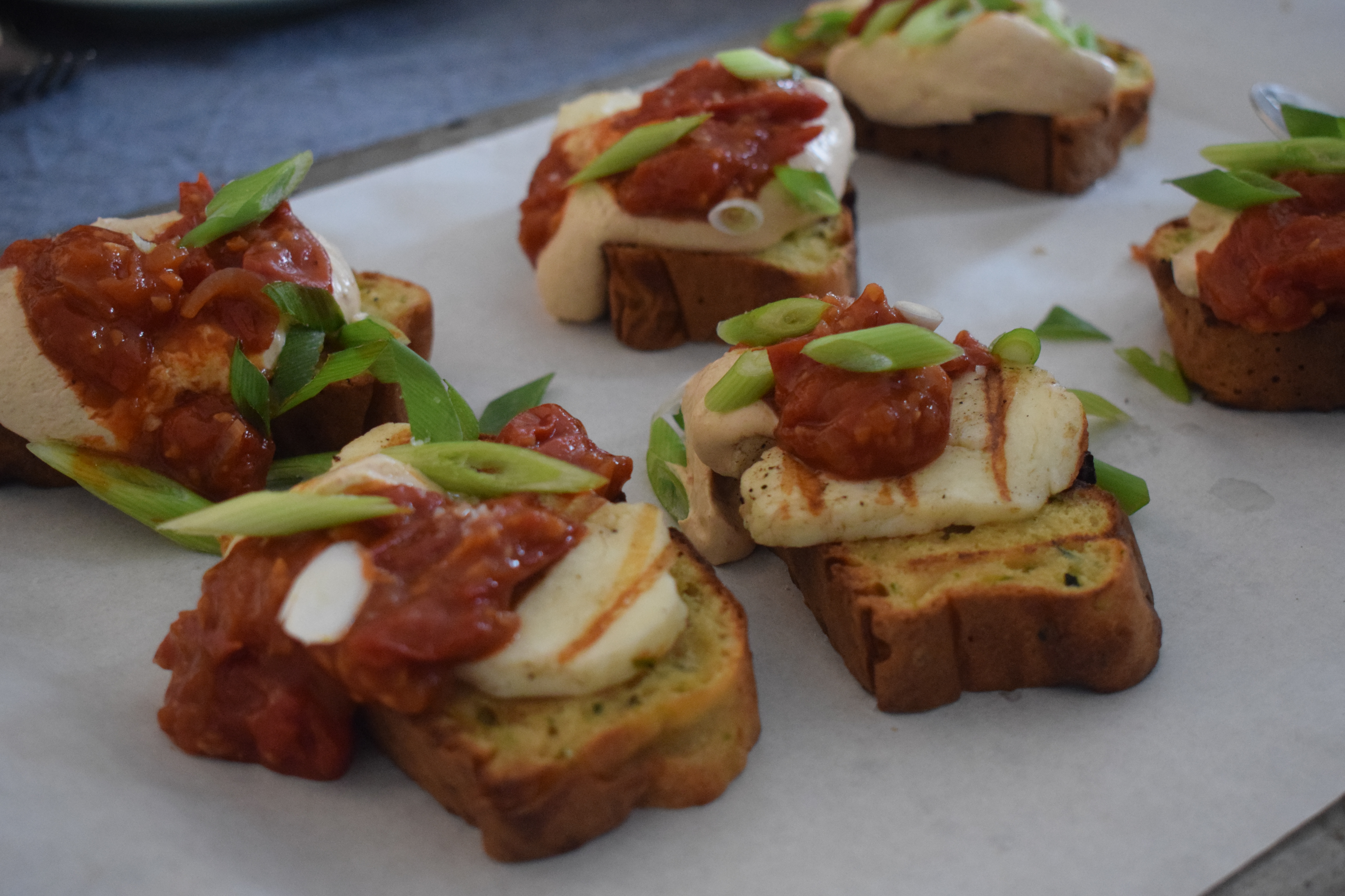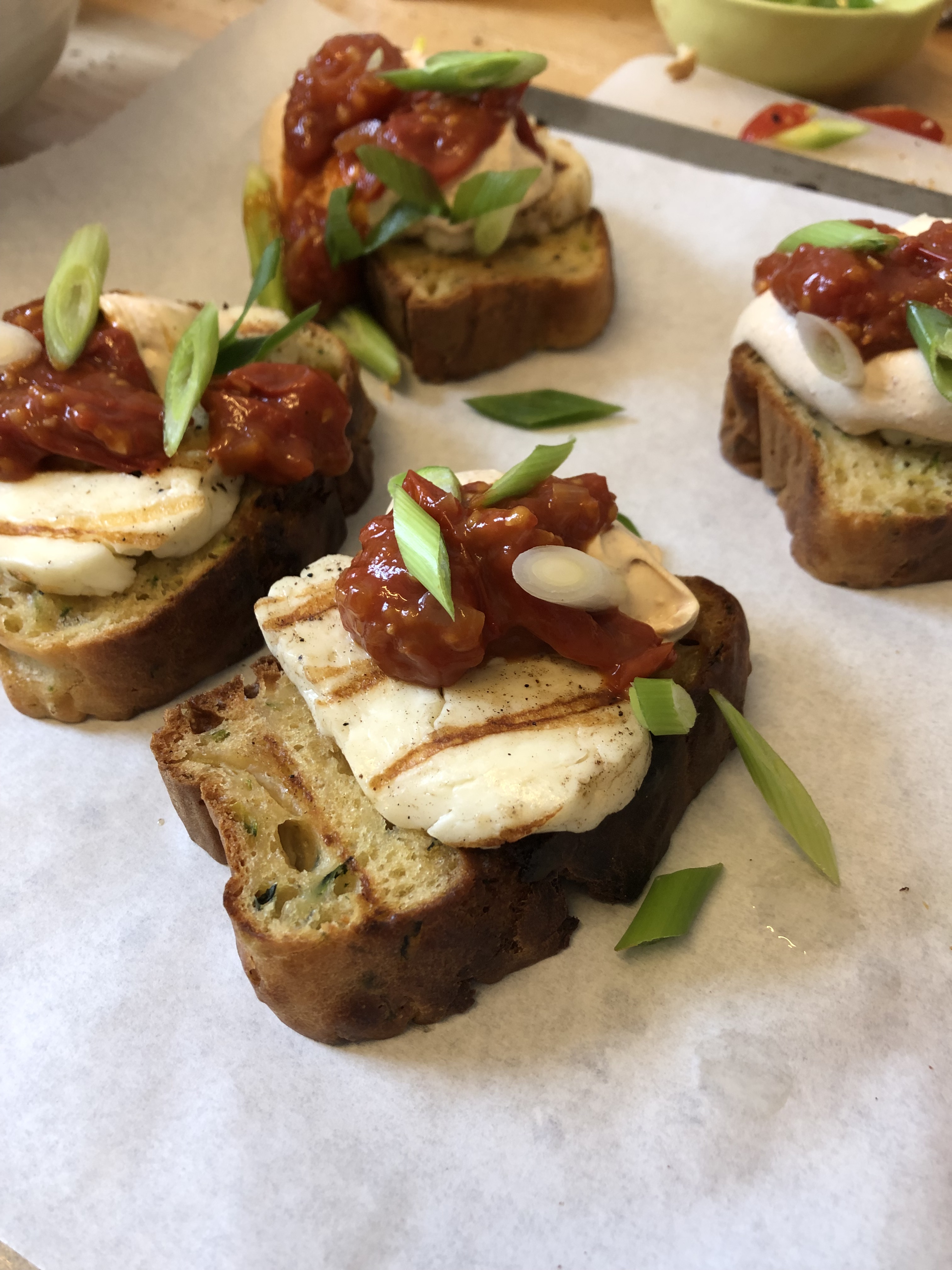 Toasted Zucchini Bread with Grilled Halloumi, Chipotle Sour Cream and Tomato Jam